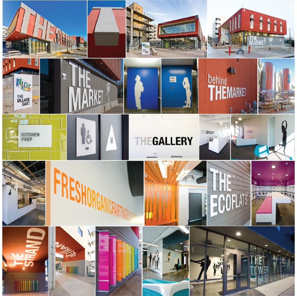 Much of the building ID’s were painted aluminum lettering, inside graphics (the people for the elevator lobbies were the students and our entire team) were vinyl and the LEED graphics were acrylic panels.